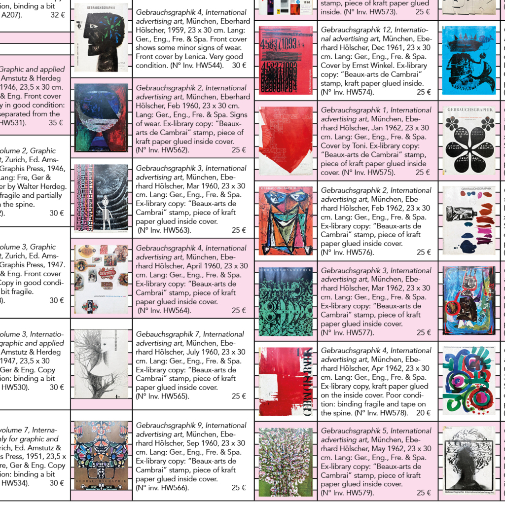 On pourra trouver dans cet ensemble différentes revues (Gebrauchsgraphik, Graphis, Caractère Noël, Divertissements typographiques, Arts et Métiers Graphiques), des spécimens typographiques de fonderies telles que Deberny et Peignot, Fonderie Olive, Typo Gabor, Amsterdam, entre autres; ainsi que des catalogues de photocompositions dont l’histoire fait le lien entre la composition au plomb et la numérisation de caractères. Certains livres de références complètent cet ensemble, notamment une édition original du Manuele Typographicum d’Hermann Zapf ou le Défense et Illustration de la lettre de Maximilien Vox illustré par Jacno entre autres.