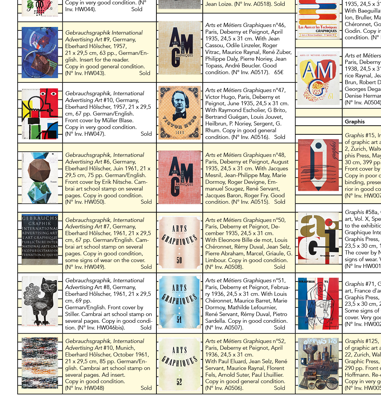 We have selected various graphic design magazines, including issues of Wlassikoff’s very own Signes (1991–1998), as well as a collection of professional industrial magazines from the 1930s that were designed by great names in French graphic design history, such as Cassandre, Francis Bernard, or Nathan. We also offer typographic specimens from foundries such as Deberny et Peignot, Fonderie Olive, and ITC, among others. A number of reference books complete the selection, along with a handful of extremely rare documents from the A-D Gallery in New York and a couple of contemporary bonuses published by Surfaces Utiles.