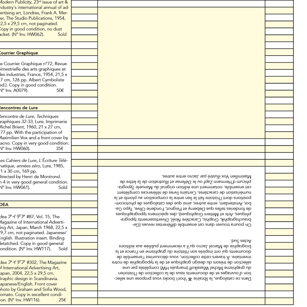 We are happy to present you with 本 \hon\ books’ second catalogue dedicated to typography, graphic design, and the history of printing. Like the first one, the majority of the books and documents on offer come from the collection of graphic design historian Michel Wlassikoff (marked N° Inv. HW), supplemented by a few treasures from our inventory (marked N° Inv. A or B).